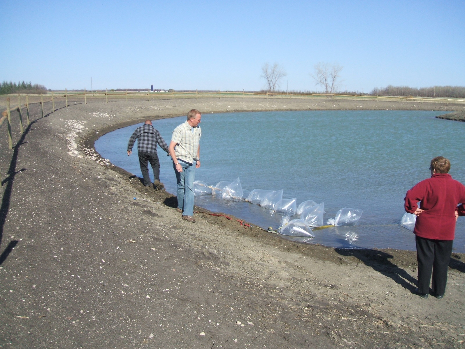 Freedom at last. After a 4 hour truck ride they are finally free to ‘keep on swimming’ like Nemo. After we released them they were jumping like crazy. I tried to take a video and if you look very carefully you can see some of them and some splashing. Later on that night we were out checking on them when our two Canada Geese came in for a visit. They had no sooner touched down on the pond when they started honking and heading for the shore. It was a very unusual way to see them acting. We are assuming that they got a surprise and maybe a nibble on the toes from the fish. It was really one of those you had to be there moments because it loses something in the translation. You truly had to be there to see and believe it.