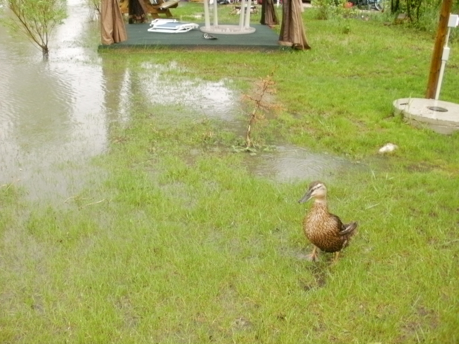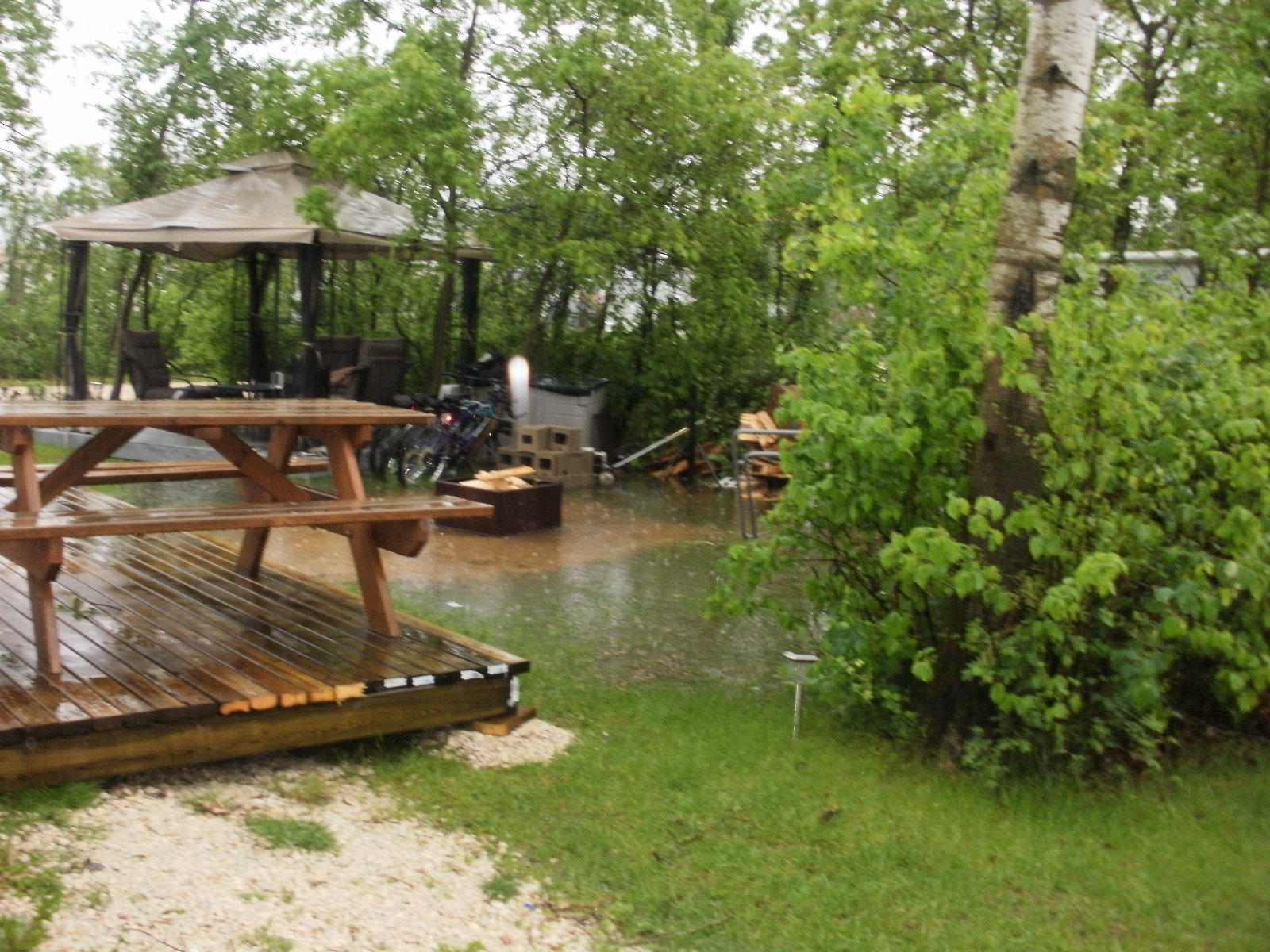I think we are all still shaking our heads in amazement that so much water could fall in so little time. We had some minor flooding issues like everyone else did, but were quite lucky overall. We had no damage and noone had their camper basements flooded. It is now Tuesday morning as I write this and things are drying up really fast around the yard. I only had one family that braved the weather to come out for weekend camping. The phone was ringing all week with cancellations. We did however have quite a few seasonals out for the weekend. On the upside of the weekend mother nature turned off the tap for a little while on Saturday morning so that we could check out the community garage sale in Warren. We did get a little bit damp, but at least we didn’t get drenched. Saturday evening we decided the only thing to do was put on a movie in the rec building.