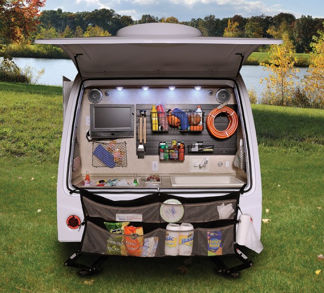 One of last year’shot trends was the outdoor kitchen which appears to still be going strong this year. The Forest River R-Pod has kicked it up a notch. (Note the TV)