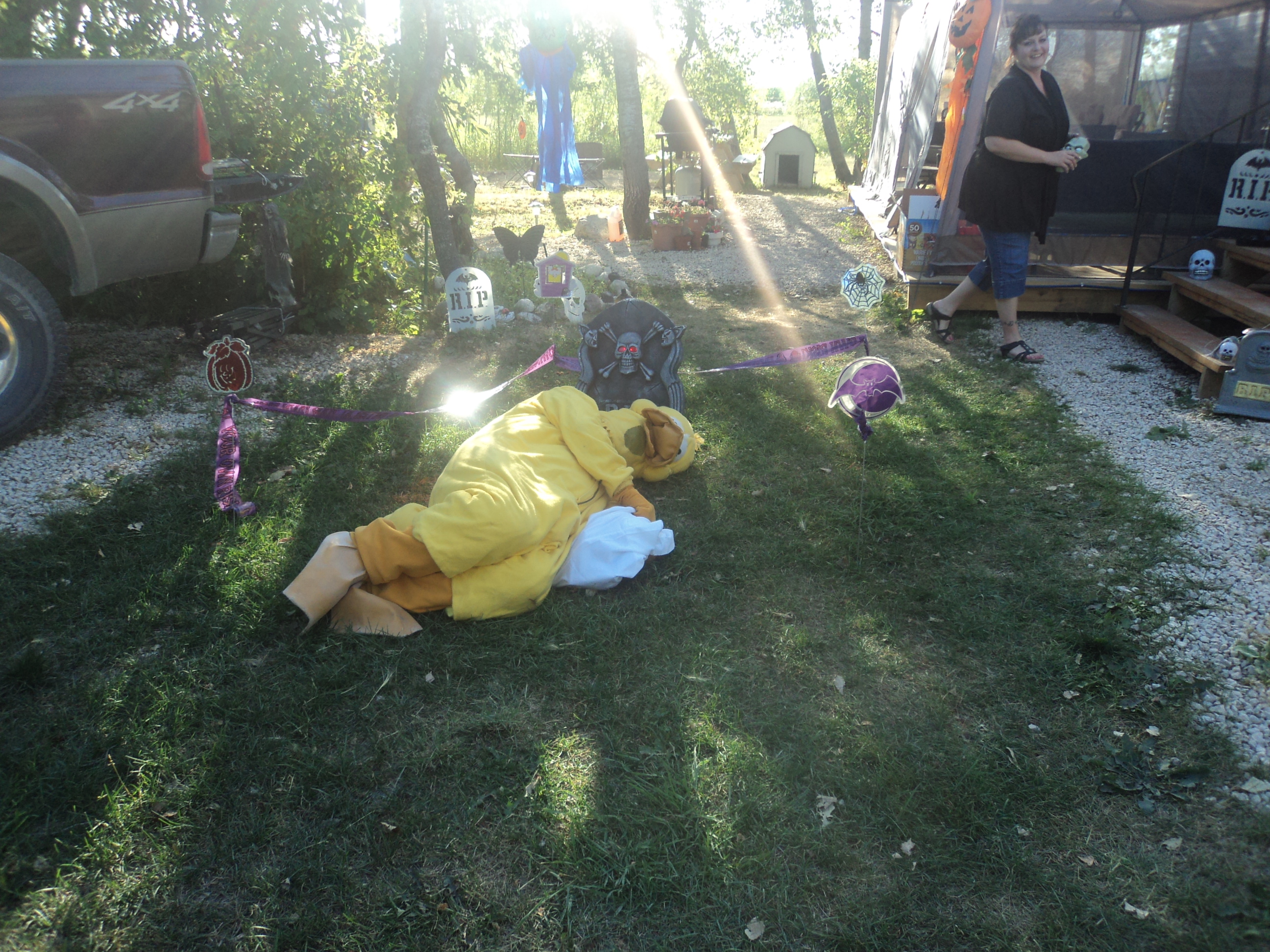 As always Halloween in August was a popular weekend. We had some good costumes and also some last minute scrounge the campsite to see what we could find costumes. Last year we had to contend with cold, pouring rain. This year we couldn’t have asked for a better day. We stuck with the tried and true and the kids never seem to tire of it. The bobbing for apples starts the day. There were some kids that I think would have bobbed all day if we let them. I didn’t count, but a couple kids must have done at least 7 apples. After the ice cream social we moved on to the ghoulish games. We wrapped some mummies and found some eyeballs in brains. Some kids were not too sure about the brains once they stuck their hands in. This face says it all