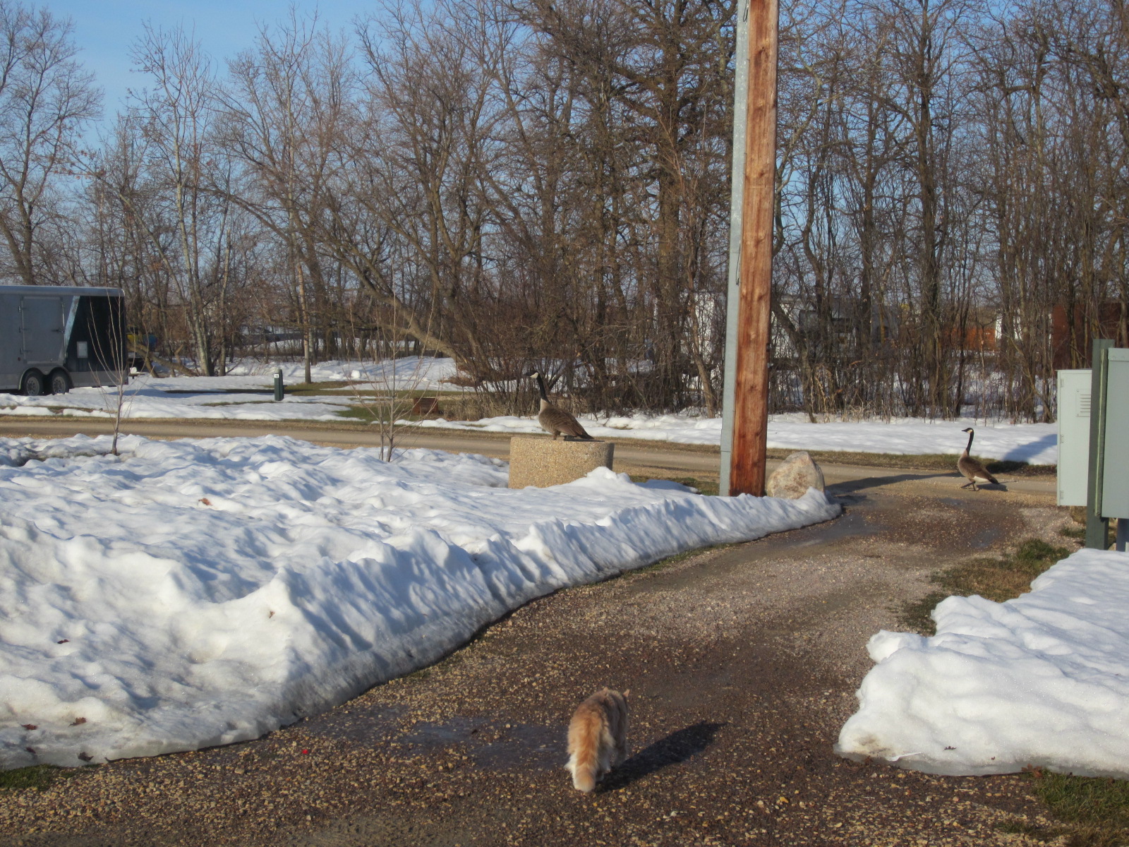 It has been a common occurrence to walk around the campground and see the Geese in the pond, by the playground, by the mini golf or wherever. But this one through me for a loop this morning.
