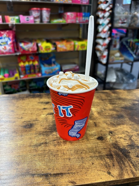 Vanilla soft serve mixed with chunks of mars bar sm 5.35 lrg 6.15