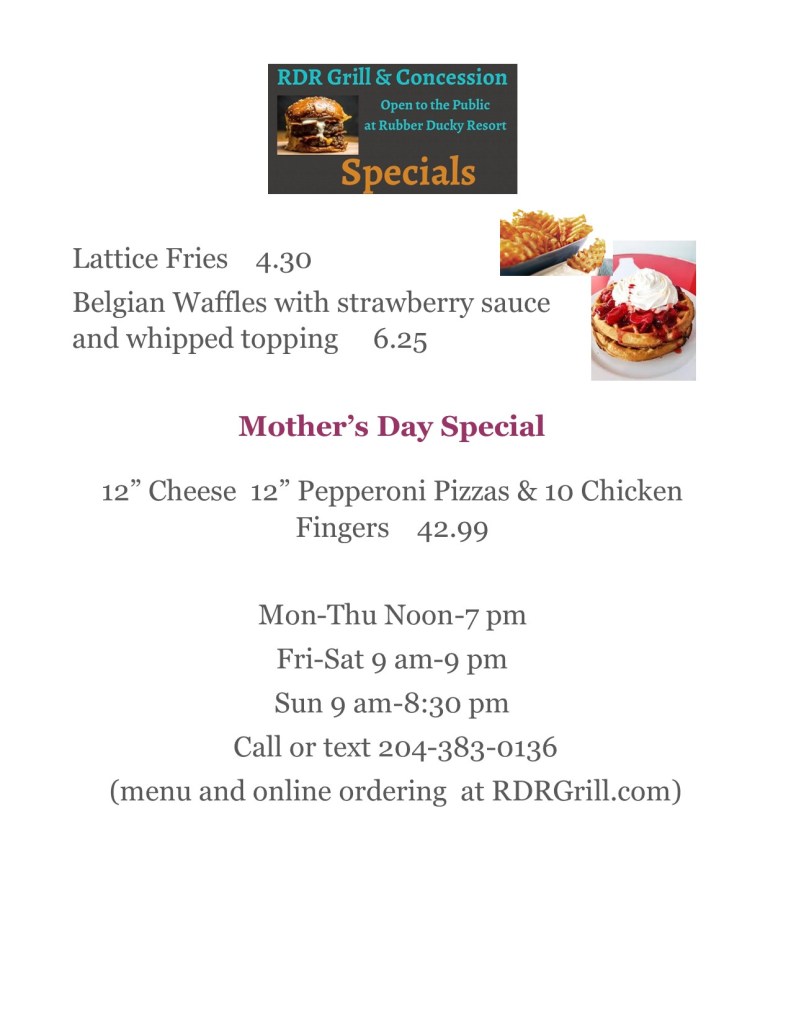 4:30pm—Virtual Bingo. Play from your campsite with any browser. Go to Bingomaker.com, search for Rubber Ducky Resort’s bingo and enter the password ‘Ducky’. There will be 2 games – one line anyway and a blackout game. If you are camping here and win take a screenshot of the winning screen showing your card # and text it to 204-818-5012 to claim a prize. More how to play details will be in the activities window of the Rec Building and also at RubberDuckyBlog.com